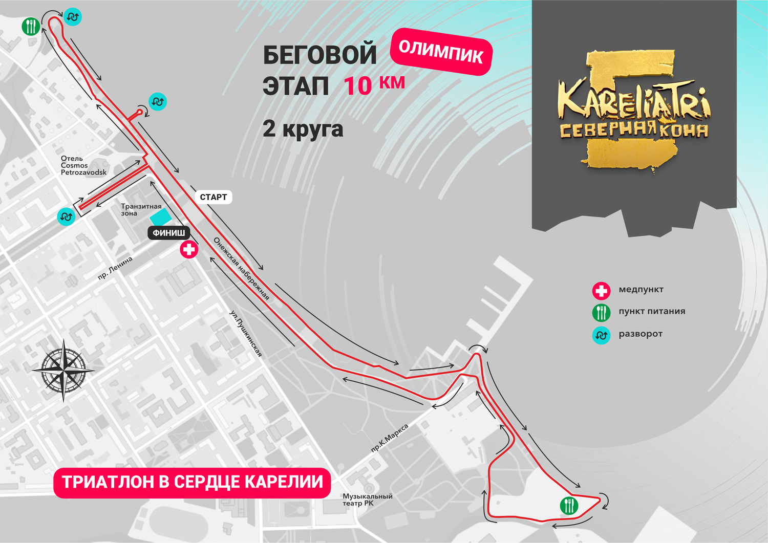 Старт состоится в самом центре города Петрозаводск. Плавательный этап пройдет в Онежском озере комфортной температурой воды. Трасса велоэтапа пролегает по центральным улицам, с отличным асфальтовым покрытием. Завершится состязание живописным беговым этапом прямо по набережной Онежского озера.